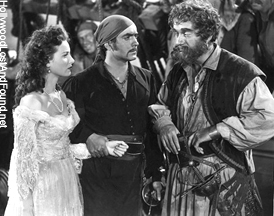"The Black Swan" was the first pirate film to be photographed in three strip Technicolor (the AFI Catalog synopsis suggests that "The Dancing Pirate" (RKO; 1936) actually had little to do with pirates), beautifully so in the hands of the legendary Leon Shamroy, ASC. In addition to showing off Miss O'Hara at her most beauteous, many shots in the film evoke classic 17th Century paintings, and include some of the most beautiful sunsets ever photographed on a soundstage. (For the record, Fairbanks' "The Black Pirate" (United Artists; 1926) was photographed in two color Technicolor.) This is all appropriately wrapped up in one of Alfred Newman's great scores, including a typically beautiful love theme. Newman would reuse his "New World" theme from this film in his classic score for "Captain From Castile" (1947). It would be interesting to see how "The Black Swan" fares against "Pirates Of The Caribbean" with contemporary audiences; these days it's hard to predict which one would come out on top. |